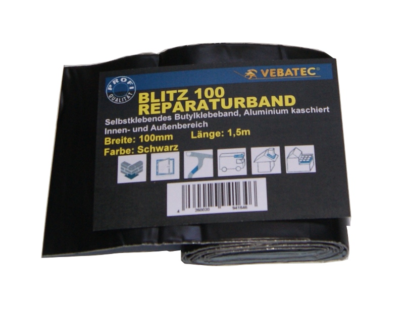 Blitz repair tape is a high quality adhesive tape consisting of butyl rubber on a carrier material of aluminum / polyester - composite. Blitz repair tape is characterized by its versatile applications in roof, wall and floor areas, combined with excellent adhesion to almost all substrates.