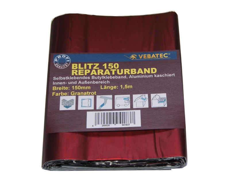 Blitz repair tape is a high quality adhesive tape consisting of butyl rubber on a carrier material of aluminum / polyester - composite. Blitz repair tape is characterized by its versatile applications in roof, wall and floor areas, combined with excellent adhesion to almost all substrates.