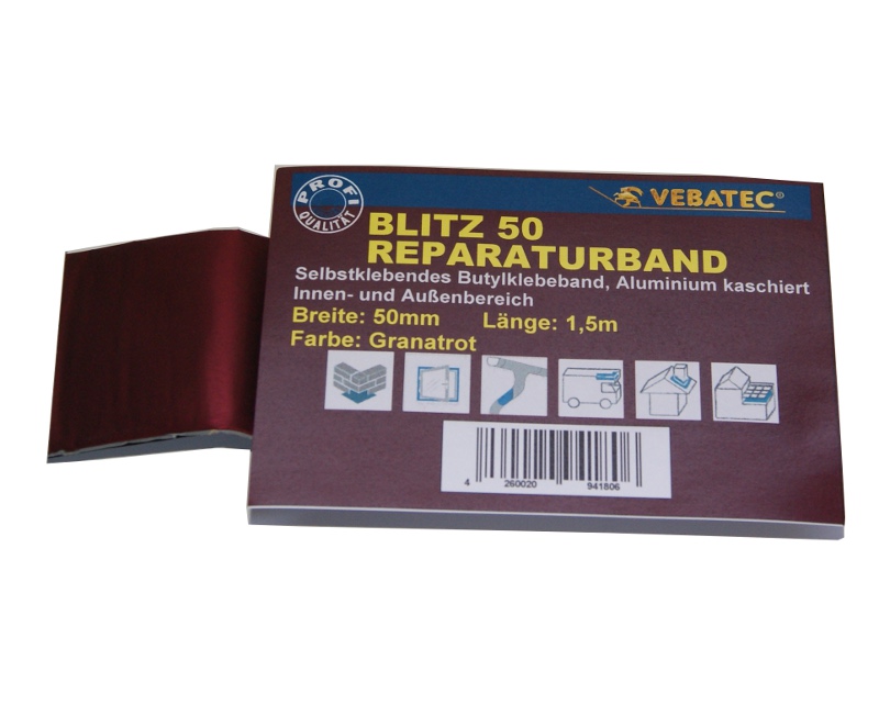 Blitz repair tape is a high quality adhesive tape consisting of butyl rubber on a carrier material of aluminum / polyester - composite. Blitz repair tape is characterized by its versatile applications in roof, wall and floor areas, combined with excellent adhesion to almost all substrates.