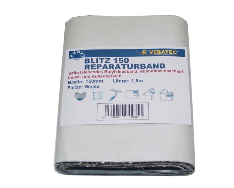 Blitz repair tape is a high quality adhesive tape consisting of butyl rubber on a carrier material of aluminum / polyester - composite. Blitz repair tape is characterized by its versatile applications in roof, wall and floor areas, combined with excellent adhesion to almost all substrates.