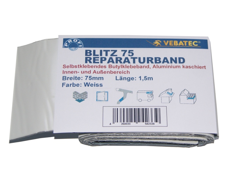 Blitz repair tape is a high quality adhesive tape consisting of butyl rubber on a carrier material of aluminum / polyester - composite. Blitz repair tape is characterized by its versatile applications in roof, wall and floor areas, combined with excellent adhesion to almost all substrates.